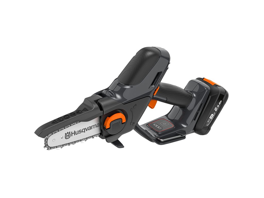 Kompaktní ruční akumulátorová prořezávací pilka, ideální pro prořezávání stromů, odstraňování nežádoucích dřevin a menší tesařské práce. Tato malá, ale všestranná prořezávací řetězová pila je dostatečně robustní, aby snadno řezala větve o šířce 75 mm. Protiskluzová rukojeť a automatické vypnutí při ponechání bez dozoru zvyšují bezpečnost při používání pily. Výměna řetězu a lišty je snadná bez použití nářadí. Pilka použivá akumulátor z 18V akumulátorového systému aliance POWER FOR ALL, díky kterému lze jeden akumulátor použít pro nástroje a vybavení více značek. Uskladnění v menších prostorech je usnadněno přibaleným háčkem vyrobeným na míru, který lze připevnit na zeď nebo použít se systémem úložných kolejnic Husqvarna Aspire™. Řetězový Bio olej je součástí balení (50 ml).