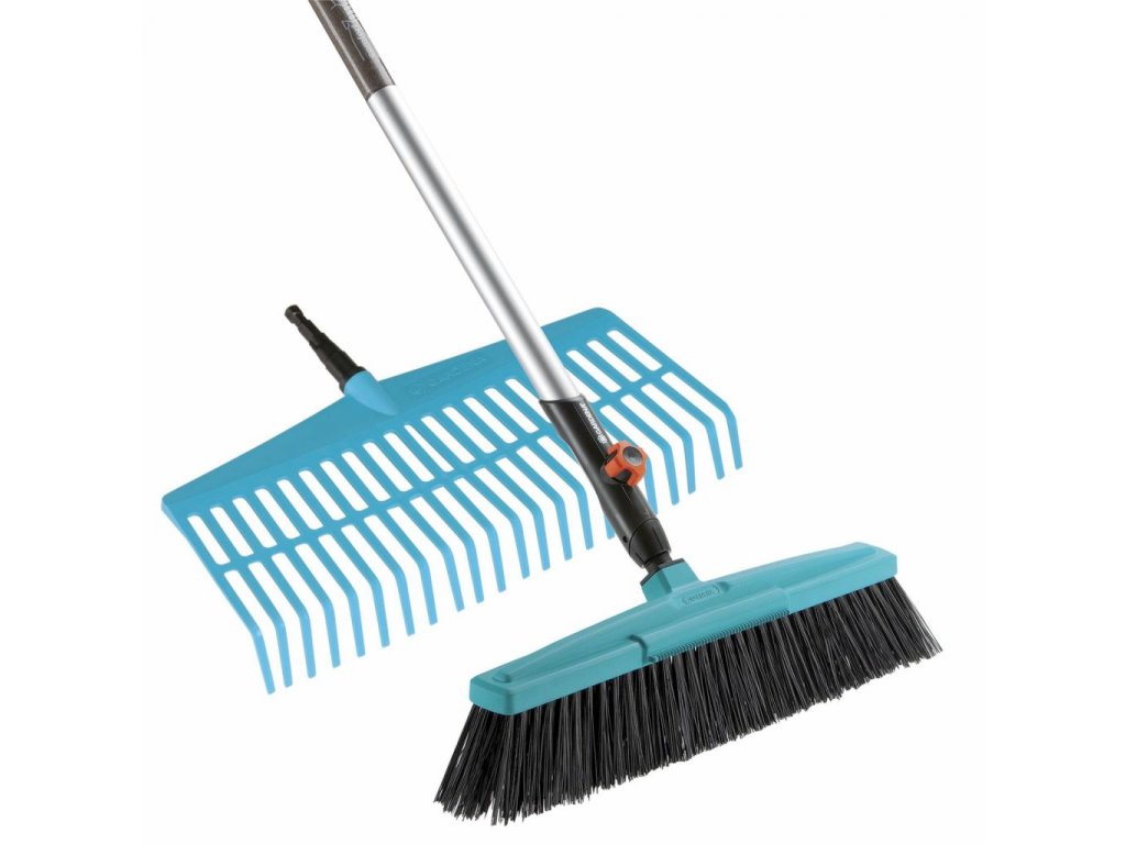 Gardena Set smetáku s násadou a hrábě na listí Combisystem Smeták na cesty Gardena Combisystem je ideální pro použití na zahradě a kolem domu. Díky pracovní šířce 45 cm a nárazuvzdorné hlavě z vysoce kvalitního plastu lze robustní koště použít k mnoha účelům.