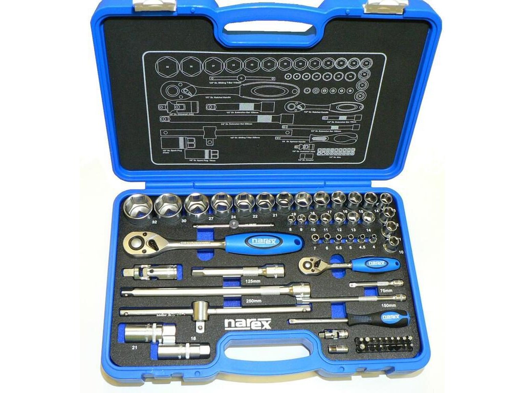 61dílná kombinovaná gola sada 1/4"&1/2" šestihranných hlavic a ovladačů v plastovém kufříku. NAREX